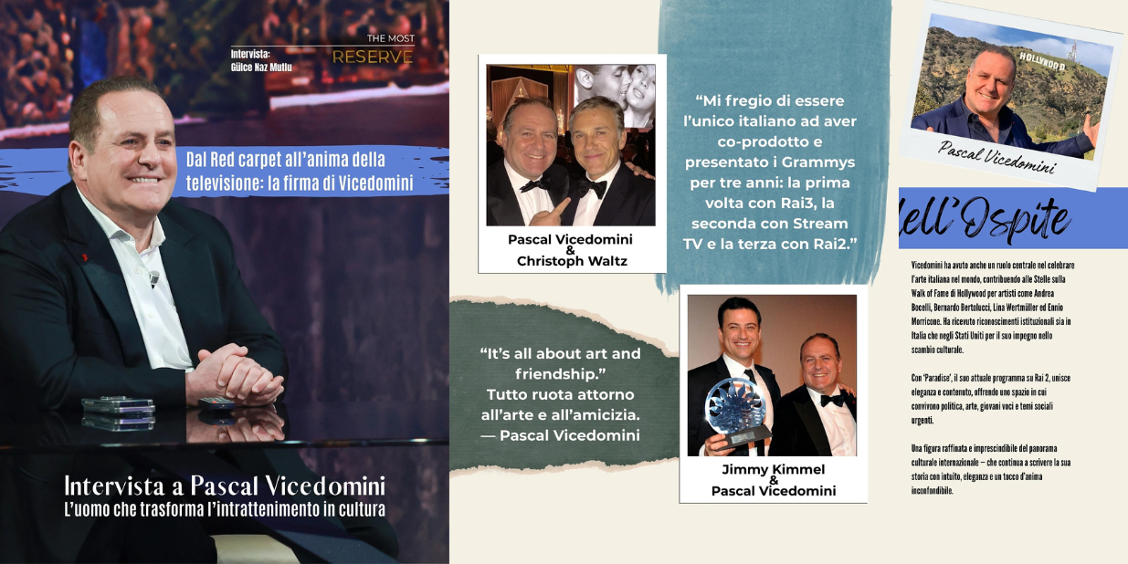 In questa intervista esclusiva per The Most Reserve, curata da Gülce Naz Mutlu, Vicedomini ci svela memorie intime e visioni globali che plasmano il suo universo artistico e culturale. È un viaggio che parte da Napoli e Roma per attraversare le sfumature di Hollywood e oltre, dimostrando come l’intrattenimento possa trasformarsi in un autentico gesto culturale e come l’eleganza assuma il ruolo di un linguaggio universale.